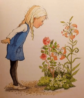 Et Pilou nous devance encore, Lou trainasse et s’arrête. Elle s’accroupit et contemple une fleur enfin à ce qui lui ressemble. Elle la regarde avec attention puis se relève. Millie tient toujours ma main.